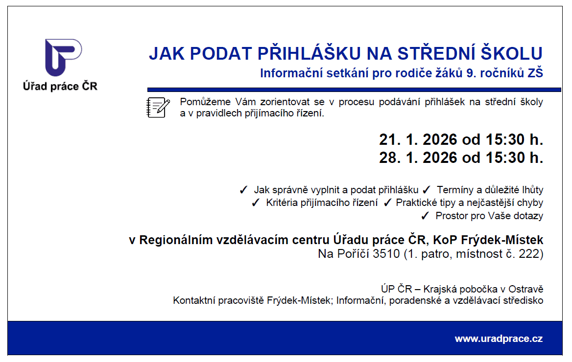 Rádi bychom Vás informovali o akci, kterou připravilo Informační, poradenské a vzdělávací středisko Úřadu práce ve Frýdku-Místku pro rodiče žáků 9....