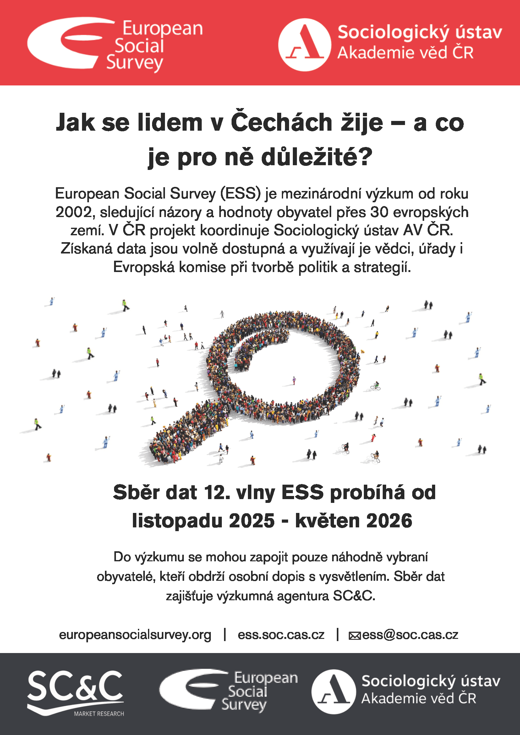 Velmi si proto vážíme ochoty respondentů zapojit se do výzkumu. Pokud budete tazatelem osloveni, budeme vděční za Vaši účast – Vaše názory a zkušenosti přispívají k lepšímu porozumění současné společnosti a umožňují jejich srovnání v mezinárodním kontextu. Zároveň tato vlna poskytne výjimečnou příležitost analyzovat rozdíly mezi různými módy dotazování a jejich dopady na výsledky výzkumu.