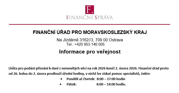 posledním dnem lhůty pro podání přiznání k dani z nemovitých věcí na rok 2026 je pondělí 2. února 2026. Z uvedeného důvodu jsou...